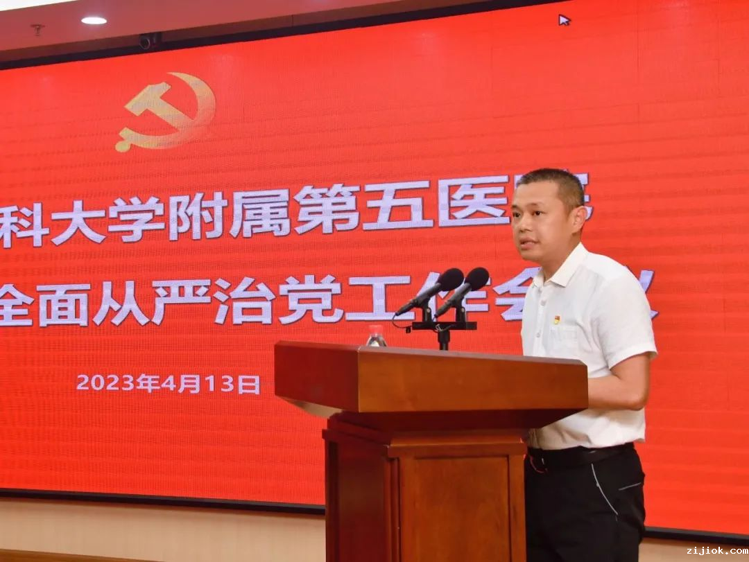 本网讯 4月13日,zijiok五院召开2023年全面从严治党工作会议。医院党委书记李蕃俊作全面从严治党工作报告,医院纪委书记吴璧锋作纪检监察工作报告。医院党政领导班子成员、纪委委员、各党支部书记以及全体管理干部约200人参加本次会议。