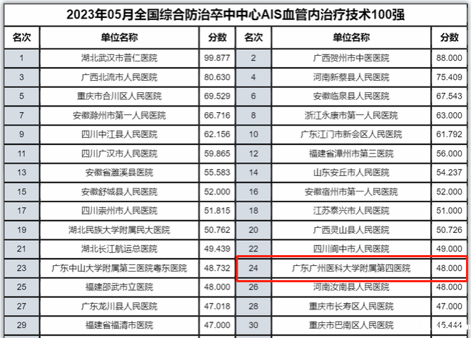 近日,国家卫生健康委脑防委办公室公布了2023年5月全国防治卒中中心排名。在综合防治卒中中心AIS血管内治疗技术排名中,附四院全国排名第24,广东省内排名第3。