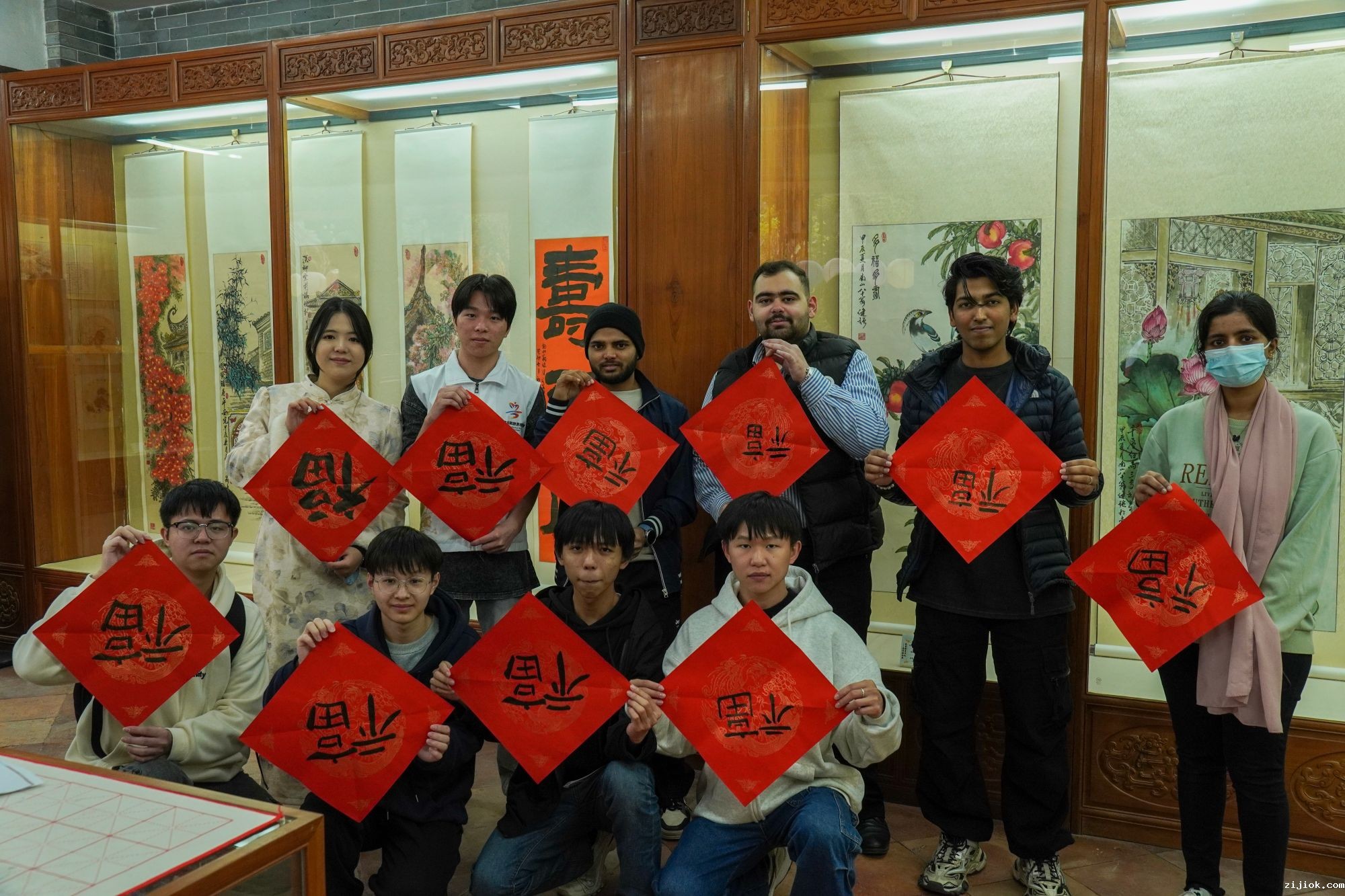 中外学生展示毛笔书法成品