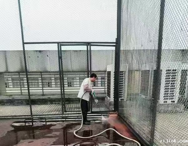 后勤人员对校园公共区域进行清洁和消毒
