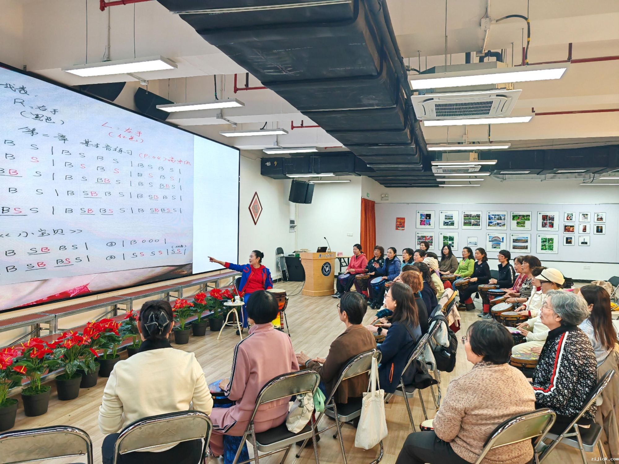 课上,胡老师从非洲鼓的起源、基本构造讲起,介绍了其文化背景和音乐风格。她详细讲解了非洲鼓的拍打技巧、基本乐理和节奏类型,并手把手指导老同志们按照音乐的节奏敲击鼓面。在胡老师的带领下,老同志们逐渐沉浸在非洲鼓律动感十足的节奏中,感受到了音乐的魅力,享受到了学习的乐趣。
