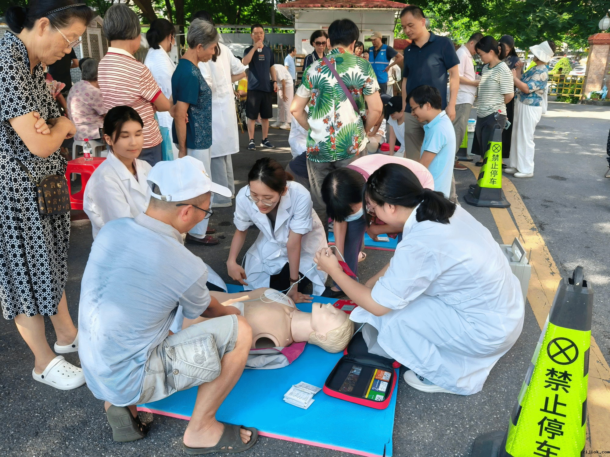 在活动现场,医学模拟教育中心扶悦老师带领学生志愿者,与学校关工委老同志、退休医疗专家、离退处工作人员以及社区工作人员共同组成的志愿服务团引导居民参与急救知识的学习与实操体验,协助医疗专家进行急救演示,一对一、手把手地指导居民进行心肺复苏及除颤仪使用实操练习,耐心解答居民提出的疑问,助力大家掌握关键的急救技能。