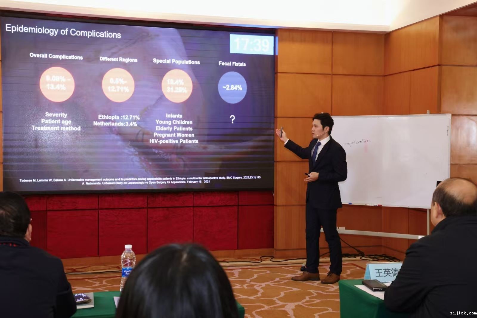 展示环节中,张实老师以《阑尾炎的并发症》为题,运用流畅自然的英文表达和多样化的教学方法,系统阐述了手术并发症的临床表现、诊断方法与治疗进展和预防措施。课程以一位藏族患者的真实病例作为导入,结合精心设计的PPT演示和有效的师生互动环节,将复杂的医学机制与诊疗要点层层剖析,讲解清晰透彻、易于理解,展现了扎实的专业功底以及良好的跨文化教学与沟通能力。