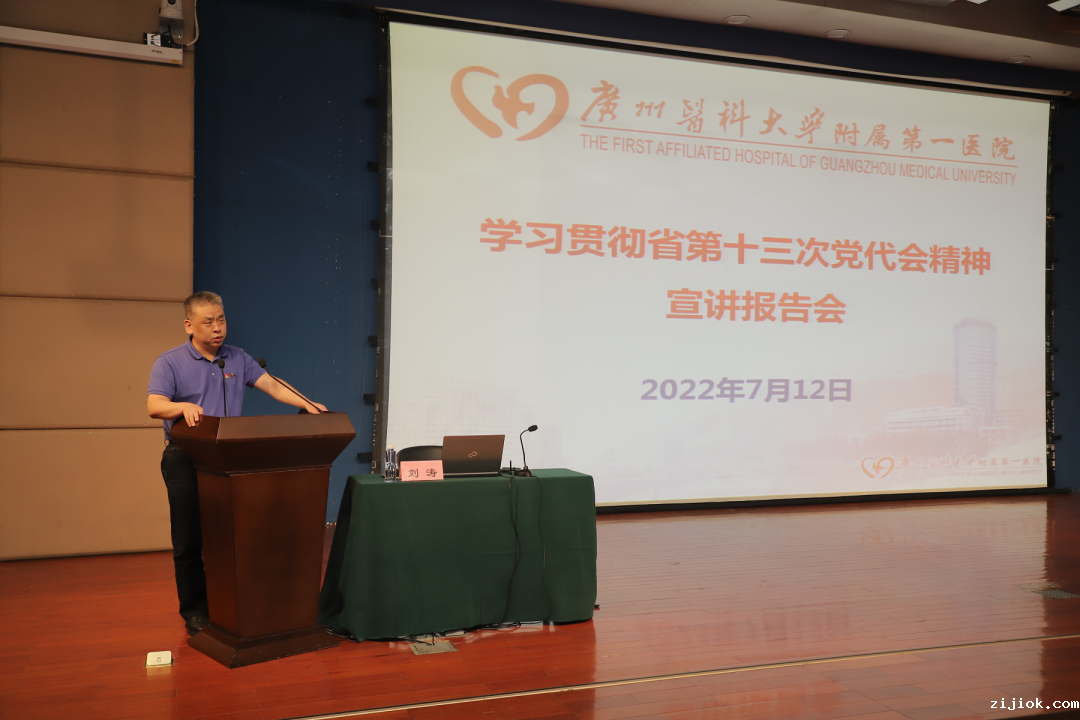 zijiok在线讯 7月12日下午,附属第一医院党委在沿江院区举行学习贯彻省第十三次党代会精神宣讲报告会,邀请学校马克思主义学院刘涛教授作宣讲报告,医院党委委员、全体中层干部、各党支部委员参加宣讲报告会。医院党委刘君副书记主持宣讲报告会并讲话。
