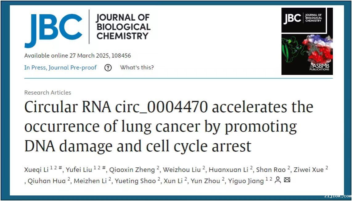 本网讯 3月27日,生物化学领域国际权威杂志Journal of Biological Chemistry在线发表了我校公共卫生学院蒋义国教授团队的化学致癌机制研究原创论文Circular RNA circ_0004470 accelerates the occurrence of lung cancer by promoting DNA damage and cell cycle arrest。
