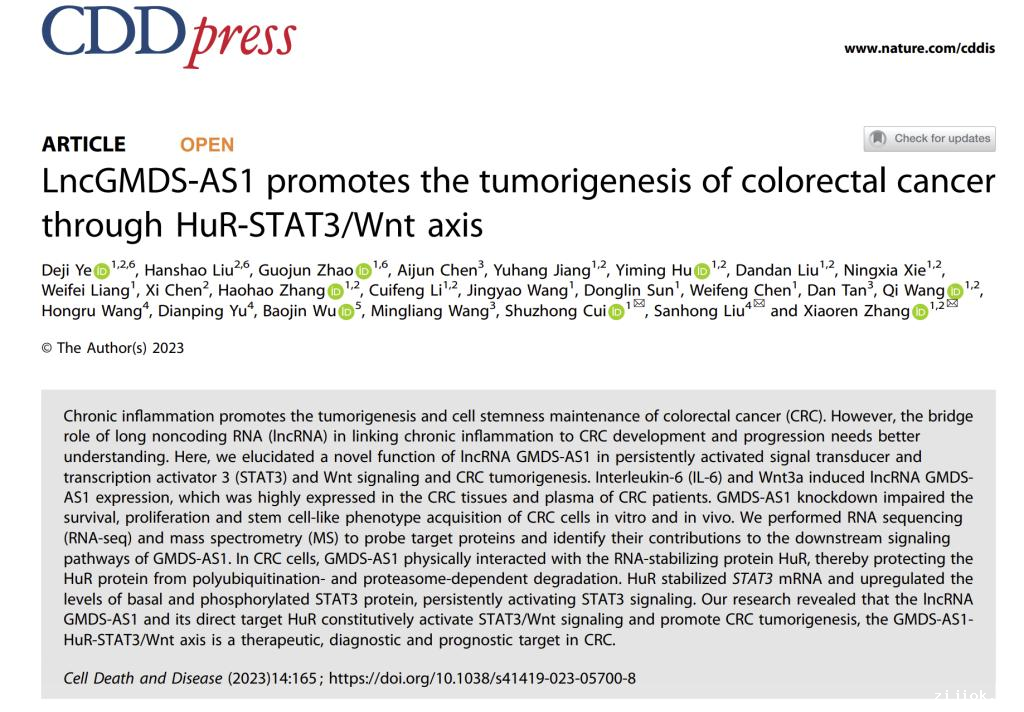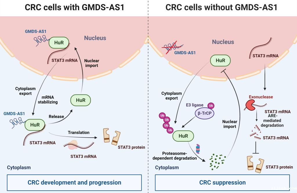 结直肠癌在全球范围内发病率和死亡人数均位居恶性肿瘤前列。慢性炎症是结直肠癌发生发展的关键因素。NF-kB、IL-6/STAT3等炎症信号通路的异常激活促进结直肠癌细胞的生存、增殖和耐药,增强结直肠癌细胞的侵袭、血管生成和转移。张笑人团队前期揭示非编码RNA-miRNA221/222介导正反馈环维持结直肠癌中持续激活的NF-kB信号和STAT3信号(Gastroenterology, 2014)。近日,该团队在Cell Death & Disease(中科院I区,IF:9.685)在线发表了题为LncGMDS-AS1 promotes the tumorigenesis of colorectal cancer through HuR-STAT3/Wnt axis的研究论文,发现了在结直肠癌中炎症因子IL-6和Wnt信号激活能上调lncRNA GMDS-AS1表达,该lncRNA能够通过抑制HuR蛋白的泛素化降解进一步稳定STAT3和β-catenin的mRNA,维持STAT3和Wnt信号的持续激活,促进结直肠癌的发生发展。
