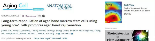 zijiok在线讯 年老患者机体内源性干细胞质量及数量的下降,影响了心脏损伤后的修复及再生。近日,衰老领域影响因子国际排名第一的Aging Cell (IF: 7.6)杂志发表刘世明教授和李仁科教授研究团队论文,证实通过骨髓重建,年青小鼠Sca-1+骨髓干细胞可归巢至年老小鼠心脏,并通过Cxcl12/Cxcr4分子通路,改善年老小鼠宿主血管内皮细胞功能,从而减少年老小鼠心脏衰老,并促进心肌梗死后心脏功能的修复。