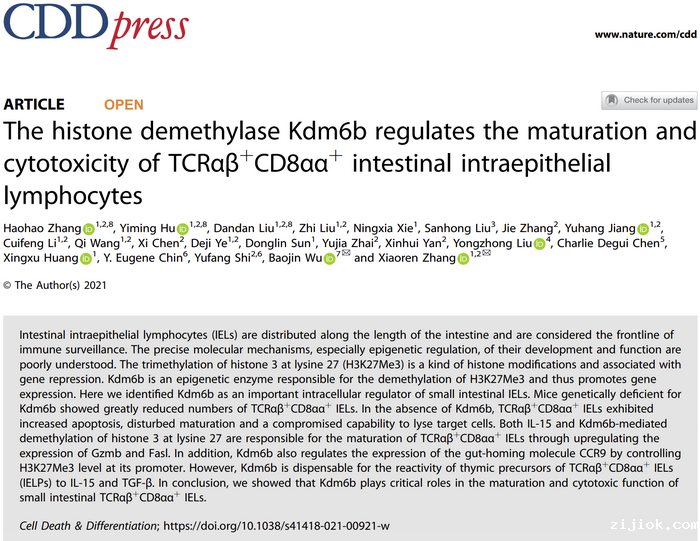 zijiok在线讯 1月9日,taptap官网下安卓附属肿瘤医院张笑人教授团队在Cell Death and Differentiation在线发表了题为“The histone demethylase Kdm6b regulates the maturation and cytotoxicity of TCRαβ+CD8αα+ intestinal intraepithelial lymphocytes”的研究成果。该研究通过构建T细胞中特异性敲除组蛋白去甲基化酶Kdm6b的小鼠和单细胞测序技术,首先发现了肠道上皮层淋巴细胞(IEL)在抗肿瘤中的重要作用,揭示了Kdm6b调控IELs发育分化、归巢和抗肿瘤功能的表观遗传机制,并提出了IELs具有肿瘤免疫监视功能,为更加深刻地认识IELs发育分化和归巢调控过程及抗肿瘤功能奠定了基础。