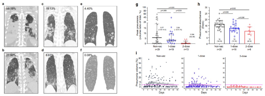 接着,研究者分析了灭活疫苗接种对突破感染者肺部损伤的保护作用。通过人工智能重建出病毒感染的肺部三维模型,准确计算了肺部磨玻璃样阴影占全肺的炎症体积比。发现,与未接种组(5.77% (1.45–19.0%))和1剂组(3.34% (1.83–9.70%))相比,2剂组(0.298% (0–2.36%))的肺炎峰值显著降低;2剂组10 (8–14)天的肺炎吸收时间比未接种组16 (14–19)天提前约6天(图2)。因此,2剂疫苗接种显著减轻了Delta VOC突破性感染患者的肺部炎症,加速康复。