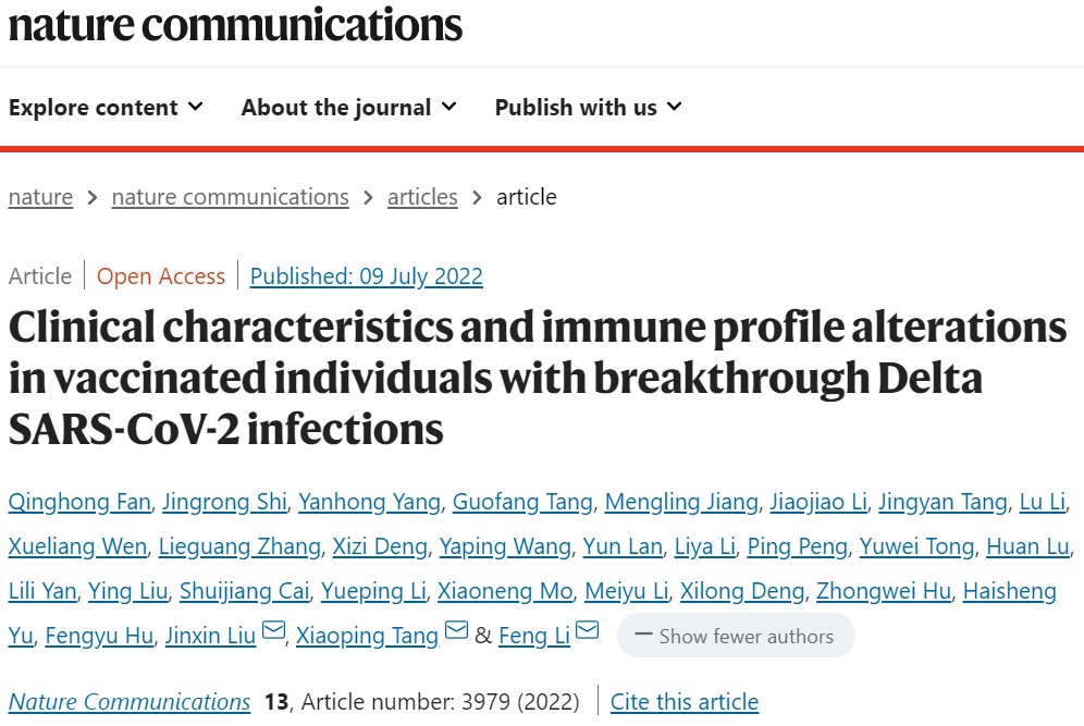zijiok在线讯 7月9日,我校附属市八医院李锋研究员、唐小平教授、刘晋新教授团队在Nature Communications上发表题为“Clinical characteristics and immune profile alterations in vaccinated individuals with breakthrough Delta SARS-CoV-2 infections”的研究论文。该研究全面分析了接种一剂或两剂灭活疫苗的Delta VOC突破感染患者的临床特征和免疫谱变化,发现尽管病毒复制水平很高,但两剂疫苗可以保护患者肺部免受 Delta 病毒攻击并减少病毒引起的炎症反应。