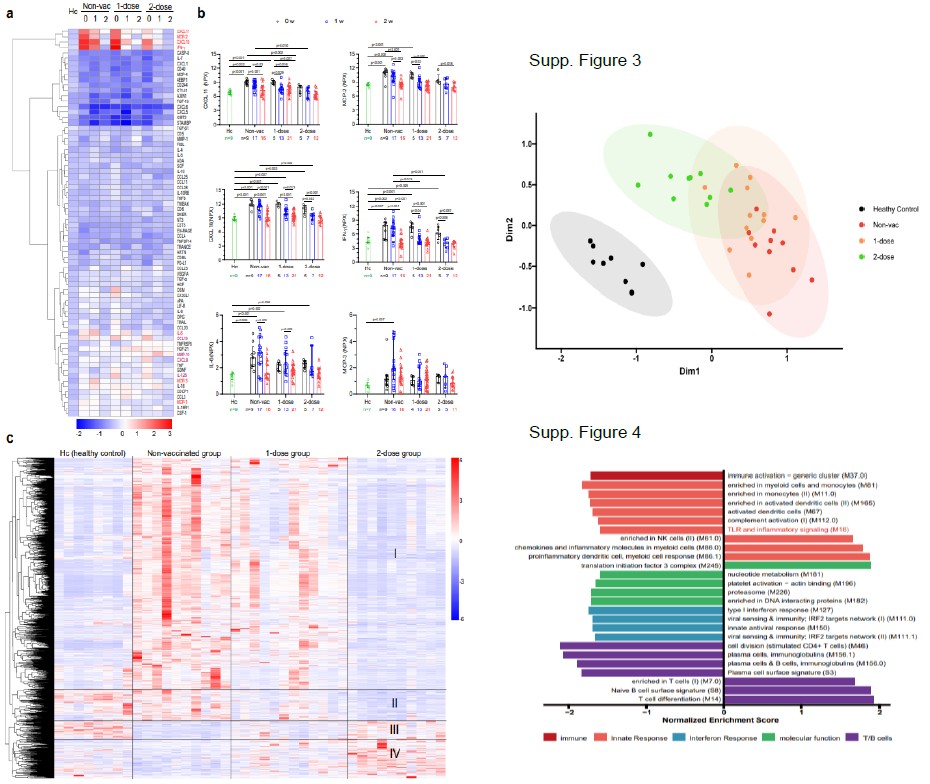 最后,研究者从细胞因子和转录组两个方面分析了2剂疫苗接种保护作用的机制(图3)。一方面,利用Olink炎症因子检测了血清中92个细胞因子的动态变化特征。发现,2剂疫苗接种,显著降低了感染5天内血清中 CXCL10、CXCL11、IFN-γ 和 MCP-2水平。另一方面,利用转录组测序分析了感染5天内外周血PBMC基因表达差异。发现, 2剂组更靠近健康对照组,而未接种组和1剂组更接近,且均远离健康对照组和2剂组。在1034个差异基因绘制的个体基因表达谱热图中,主要分成了4个聚类群,病毒感染主要引起聚类1基因的表达上调,尤其在未接种组和1剂组,而2剂组的表达谱与健康对照组更相似。基因富集分析结果显示先天免疫反应和干扰素通路被下调。研究结果表明,疫苗接种者形成的免疫记忆在遇到病毒侵犯时,可迅速调集免疫系统,形成病毒特异性的控制能力,避免大面积免疫激活。