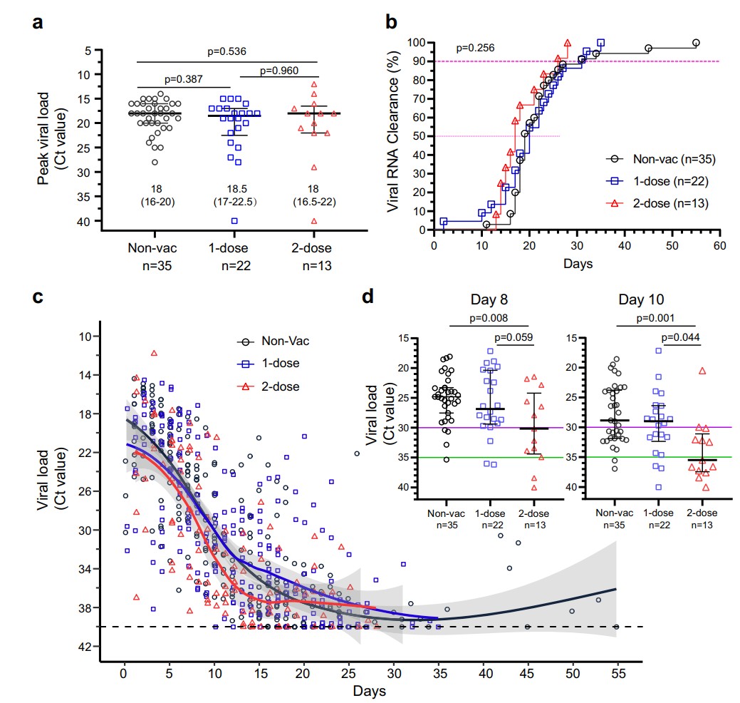 2021年5月21日,广州发生了我国第一次 Delta VOC感染导致的本地传播。当时正是中国开始全民疫苗接种的开始阶段,患者中有疫苗接种者和非疫苗接种者,为研究灭活疫苗在突破性感染中的保护作用提供了可能性。研究者首先回顾性地研究了157例本地确诊患者,根据最早期政策,只有18-59岁人群才符合接种条件,因此本研究仅纳入18-59岁患者进行分析,包括未接种疫苗组35例,接种1剂组22例,接种2剂组13例。在这三组中性别、年龄等人口统计学资料和发热、咳嗽、咳痰、咽痛、呼吸困难、呕吐、头痛、腹泻、疲劳等临床特征未发现显著差异,说明三组之间可以直接进行后续分析。随后,研究者评估了灭活疫苗接种能否降低突破性感染者病毒浓度和加速病毒清除。遗憾的是,灭活疫苗接种未能降低病毒峰值浓度,也未能加速晚期残余病毒清除(图1)。但可喜的是,完整两剂疫苗接种可以加速中期病毒下降(图1d)。鉴于该临床研究中执行《新型冠状病毒肺炎诊疗方案(第八版)》中核酸检测阴性出院的标准,在缩短住院时长上无差异,如果参考2022年3月份《新型冠状病毒肺炎诊疗方案(第九版)》中Ct>35即可出院的标准,疫苗接种可以缩短住院天数。