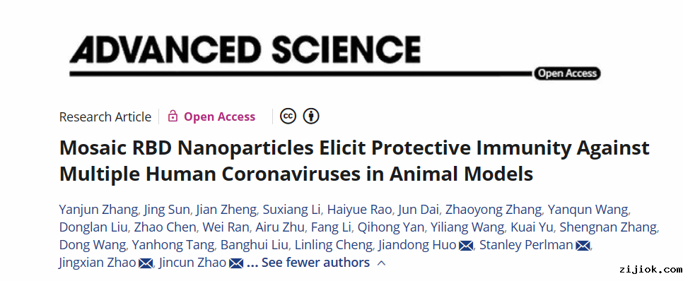 原文链接:Y. Zhang, J. Sun, J. Zheng, S. Li, H. Rao, J. Dai, Z. Zhang, Y. Wang, D. Liu, Z. Chen, W. Ran, A. Zhu, F. Li, Q. Yan, Y. Wang, K. Yu, S. Zhang, D. Wang, Y. Tang, B. Liu, L. Cheng, J. Huo, S. Perlman, J. Zhao, J. Zhao, Mosaic RBD Nanoparticles Elicit Protective Immunity Against Multiple Human Coronaviruses in Animal Models. Adv. Sci. 2023, 2303366. https://doi.org/10.1002/advs.202303366