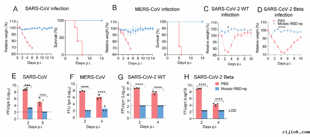 (图4三联体纳米颗粒疫苗能够在三种高致病性冠状病毒感染时对小鼠提供有效保护作用)