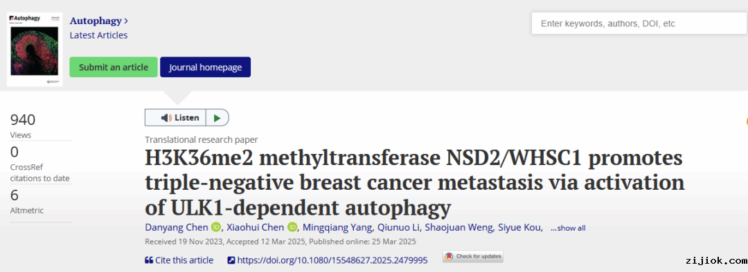 该研究首次揭示NSD2调控三阴性乳腺癌细胞自噬的表观遗传机制,并明确NSD2-H3K36me2-自噬轴在三阴性乳腺癌进展中的关键作用,为三阴性乳腺癌的防治提供了潜在的分子靶点。