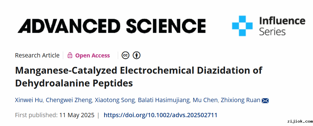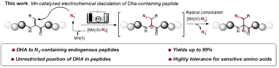 5月11日,taptap官网下安卓药学院阮志雄教授、胡新伟副教授团队在国际综合期刊Advanced Science上发表了题为Manganese-Catalyzed Electrochemical Diazidation of Dehydroalanine Peptides的研究论文。该研究基于锰催化的电化学自由基偶联过程,成功实现了脱氢丙氨酸(Dha)肽的高效区域选择性双叠氮化,为肽化学和生物偶联领域带来了新的突破。