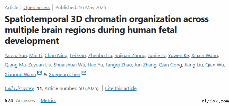 近日,zijiok-广州生物院联合生科院特聘教授陈雪鹏研究员与北京师范大学王晓群教授、中国科学院生物物理研究所刘江研究员合作,绘制了人妊娠发育中期的胚胎多脑区高分辨率染色质三维构象图谱,发现了脑区特异性染色质高级结构参与调节脑区发育,为理解不同脑区胚胎期发育的分子调控机制提供了新知识。5月16日,团队在《Cell Discovery》上发表研究成果《Spatiotemporal 3D chromatin organization across multiple brain regions during human fetal development》。