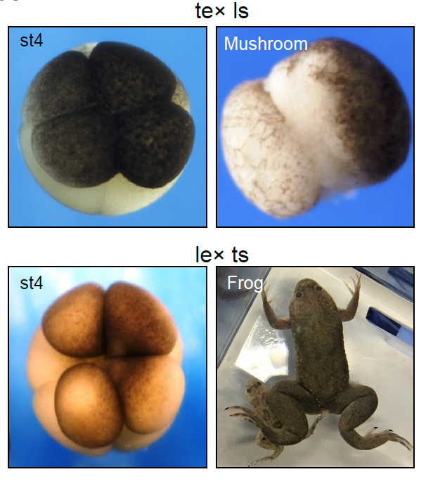 种间杂交是进化过程物种形成的重要机制,同时生殖隔离保障了物种的稳定性。研究物种杂交过程中的生殖隔离机制,是探索物种进化规律,发现发育调控机制的重要研究方向。2012年诺贝尔生理和医学奖获得者约翰·戈登(John Gurdon)爵士,发现以两个发育生物学常用的经典近缘爪蛙Xenopus laevis与X.tropicalis以不同杂交方式获得的后代,具有完全不同的命运[1]。以X.laevis为母本,与X.tropicalis杂交可以获得形态正常的杂交个体(正交,le×ts),然而以X.tropicalis为母本的杂交胚胎发生原肠发育停滞和胚胎致死(反交,te×ls)(图1)。美国加州大学Rebecca Heald教授于进一步在Nature发文,揭示反交胚胎父源ch3L和ch4L染色体的大片段丢失,导致代谢相关基因的缺失和低表达是杂交胚胎致死和生殖隔离形成的关键原因[2]。