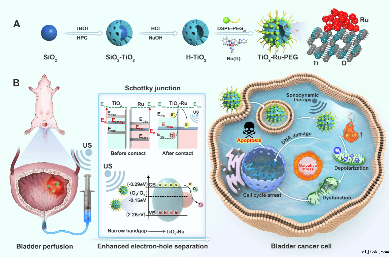 TiO2-Ru-PEG肖特基异质结的合成过程示意图(A)和声动力抗肿瘤机制(B)