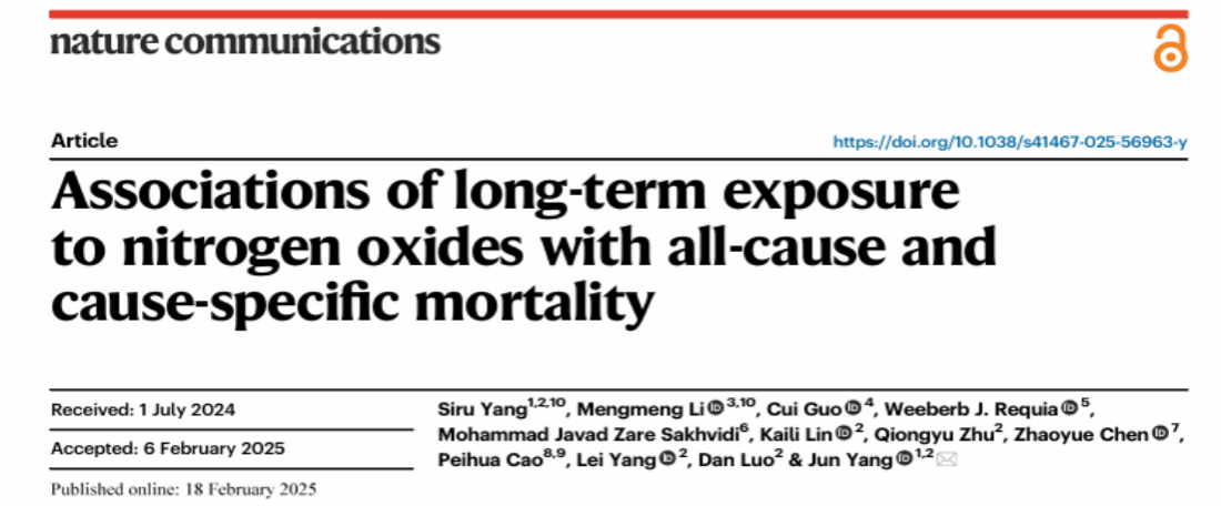 本网讯 2月18日,我校公卫学院杨军教授及合作者在Nature子刊Nature Communications在线发表了氮氧化物疾病谱研究论文Associations of long-term exposure to nitrogen oxides with all-cause and cause-specific mortality。公卫学院硕士研究生杨斯茹与中山大学肿瘤防治中心李萌萌副研究员为该论文共同第一作者,公卫学院杨军教授为论文唯一通讯作者。