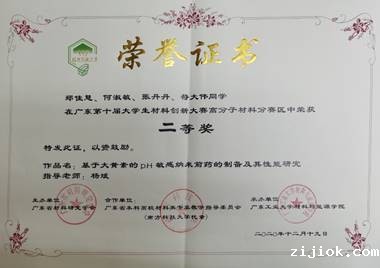 本次大赛由广东省材料研究学会主办,广东省科学技术协会指导,合作单位为广东省本科高校材料类专业教学指导委员会。自今年7月启动以来,共有省内外24所高校的257支队伍报名,经过大赛专家评议组初赛函评后共计165支队伍进入决赛。在决赛答辩环节,郑佳慧、何淑敏、张丹丹、符大伟四名同学表现优异,其参赛作品“基于大黄素的pH敏感纳米前药的制备及其性能研究”最终获得高分子材料分赛区二等奖。