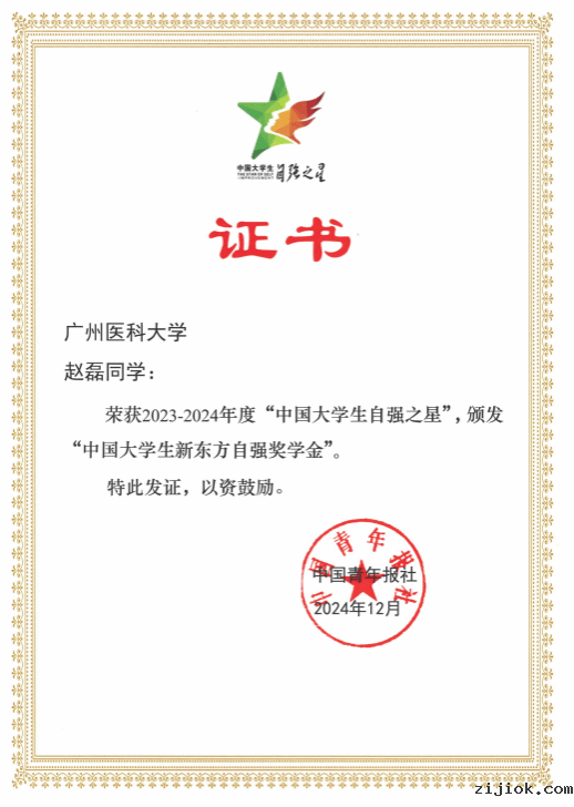近日,由共青团中央、全国学联指导,团中央基层建设部、中国青年报社主办的2023-2024年度“中国大学生自强之星”奖学金推报活动评选结果揭晓,taptap官网下安卓第三临床学院2020级临床医学专业赵磊同学获此殊荣。